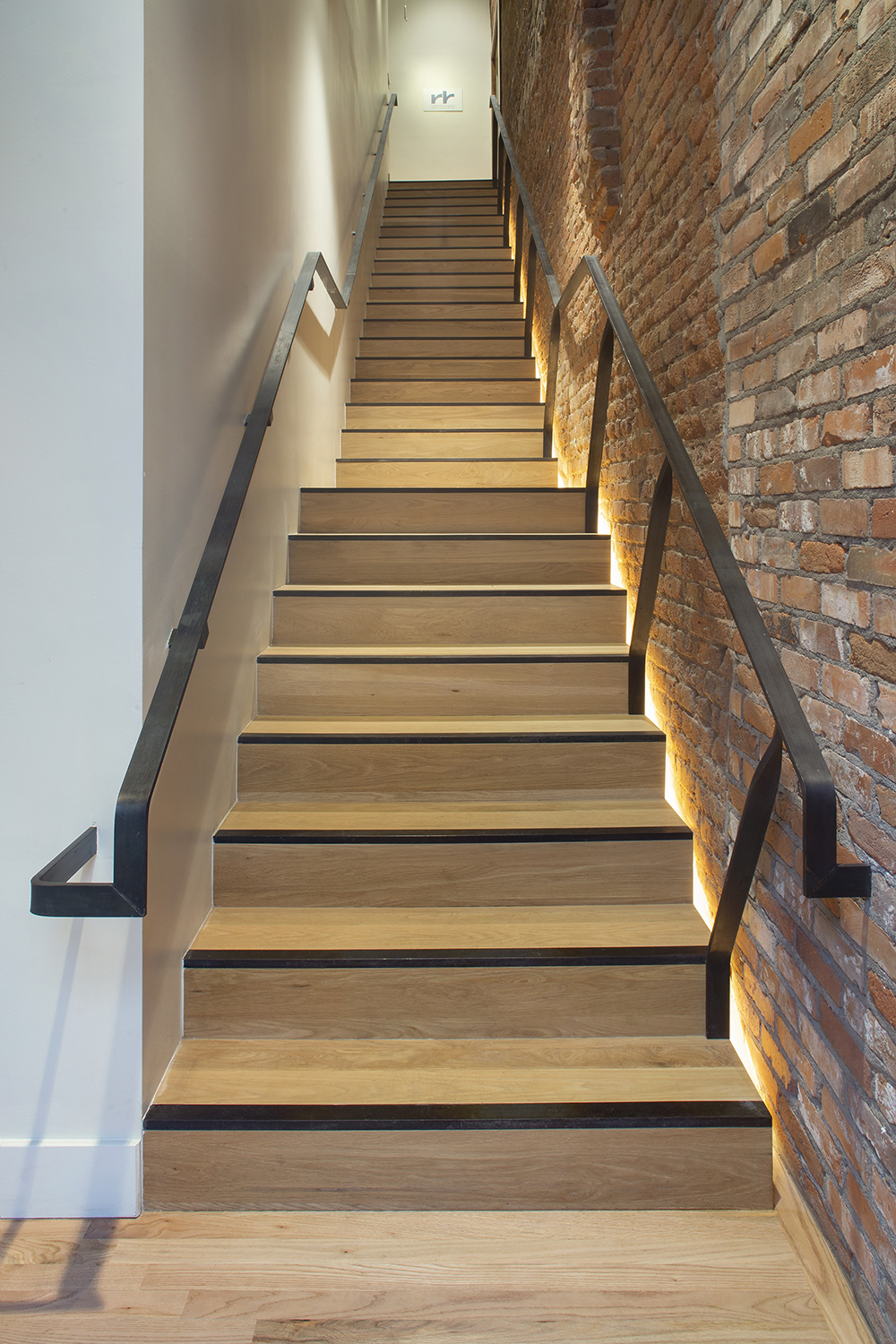 Spring of 2019 saw a reconfiguration and energy-efficiency upgrade to the interior. Previous non-historic partition walls and restrooms were removed and upgraded with energy-efficient features, such as occupancy- and daylight-sensors and LED lighting, and accessible restrooms and spaces. Consistent with the functional warehouse operation of the building’s original tenant, an open plan was employed and original columns and structure were left exposed.