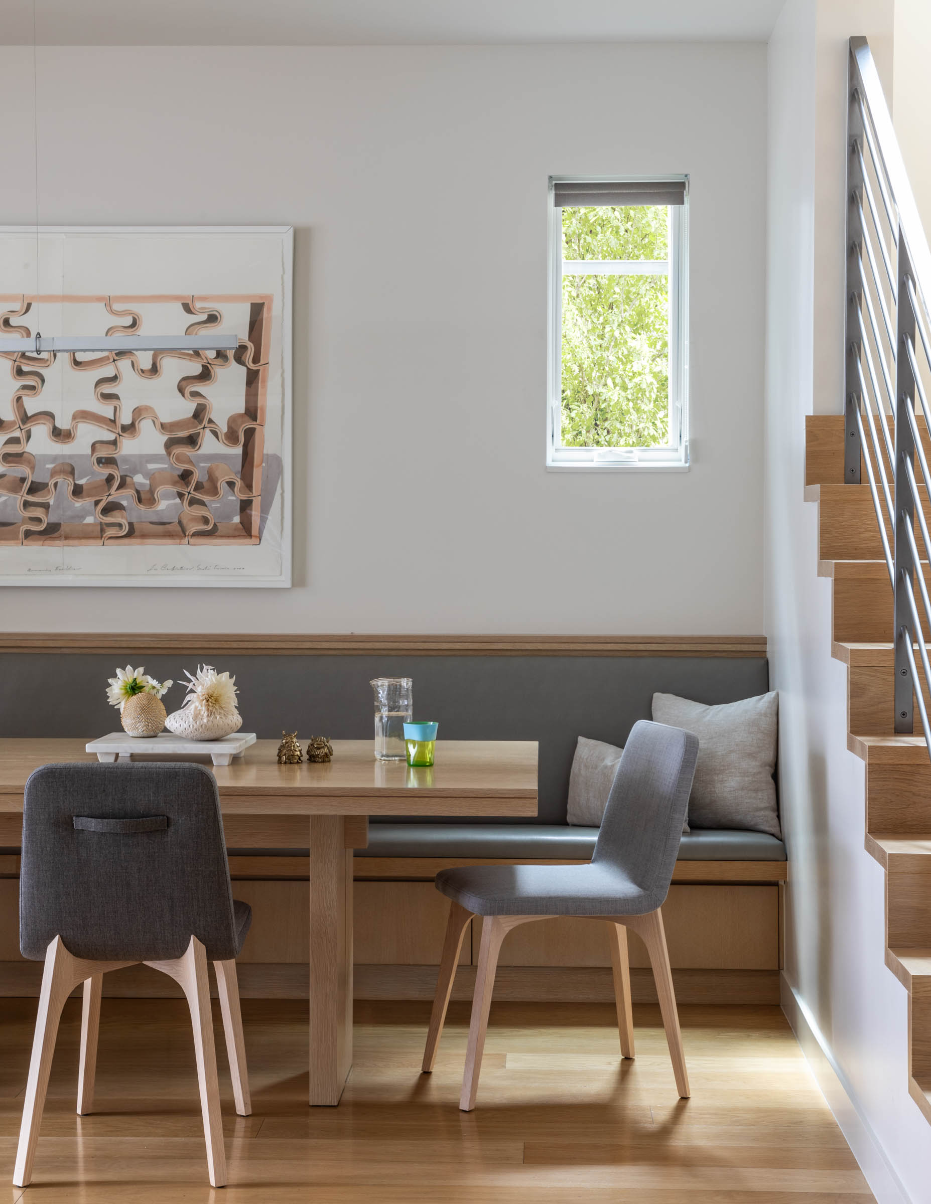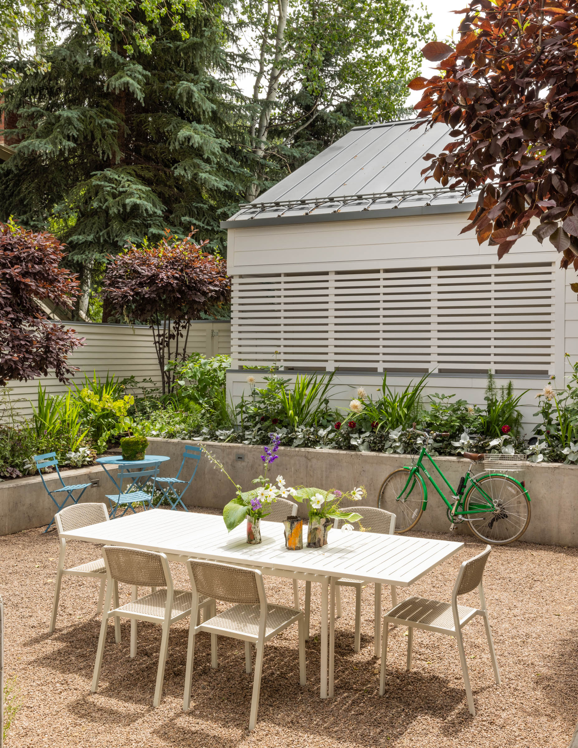 In back, lift-and-slide floor-to-ceiling glass pocket doors open the entirety of the main floor to a covered outdoor living room running the full width of the residence. Broad steps lead down to a gravel-covered bocce court that also serves as a storm-water filtration system. The court is flanked by concrete planters that soften the garden’s edges with greenery and lightly screen the lot from the neighbors.