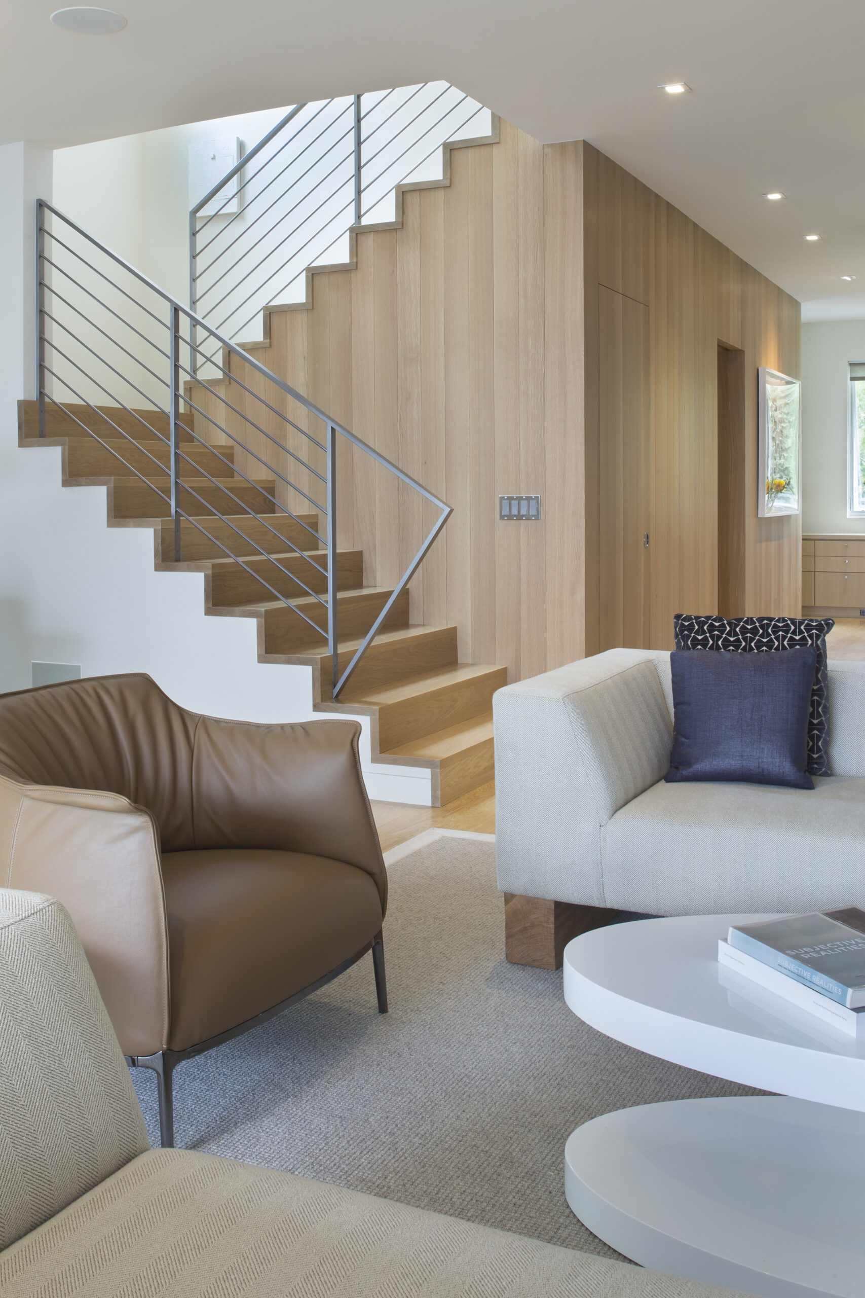 The interior is notable for the restraint of its material palette, largely limited to concrete, white oak, and white-painted walls, and the gracious apportioning of space. Game On’s 3,300 square feet are divided equally between three floors: a spacious, well-equipped subterranean wellness center; a main level with a foyer and office in front and a kitchen/living/dining space on the garden side; and a primary suite – incorporating a large bedroom, and a bath with a steam shower and cedar soaking tub – and guest room upstairs.