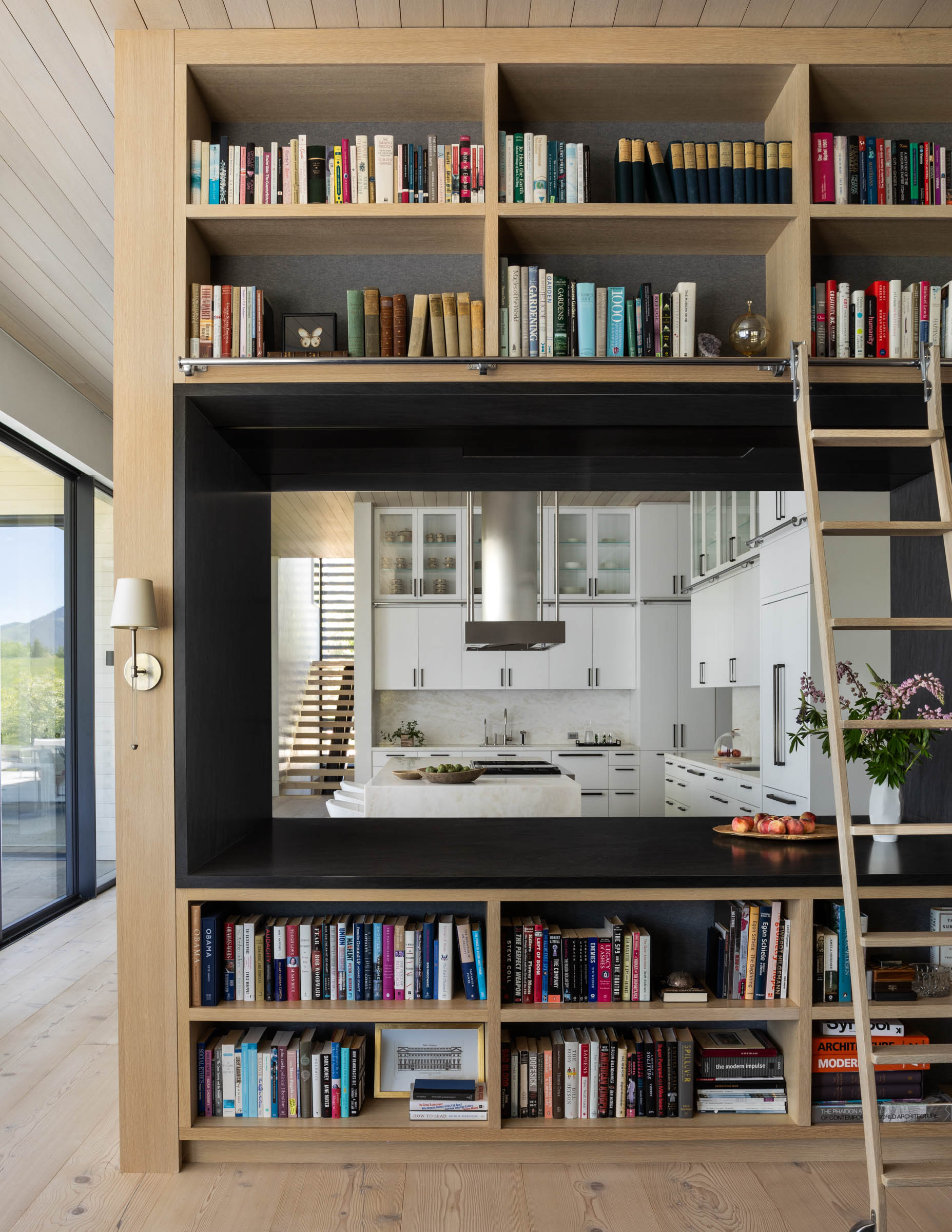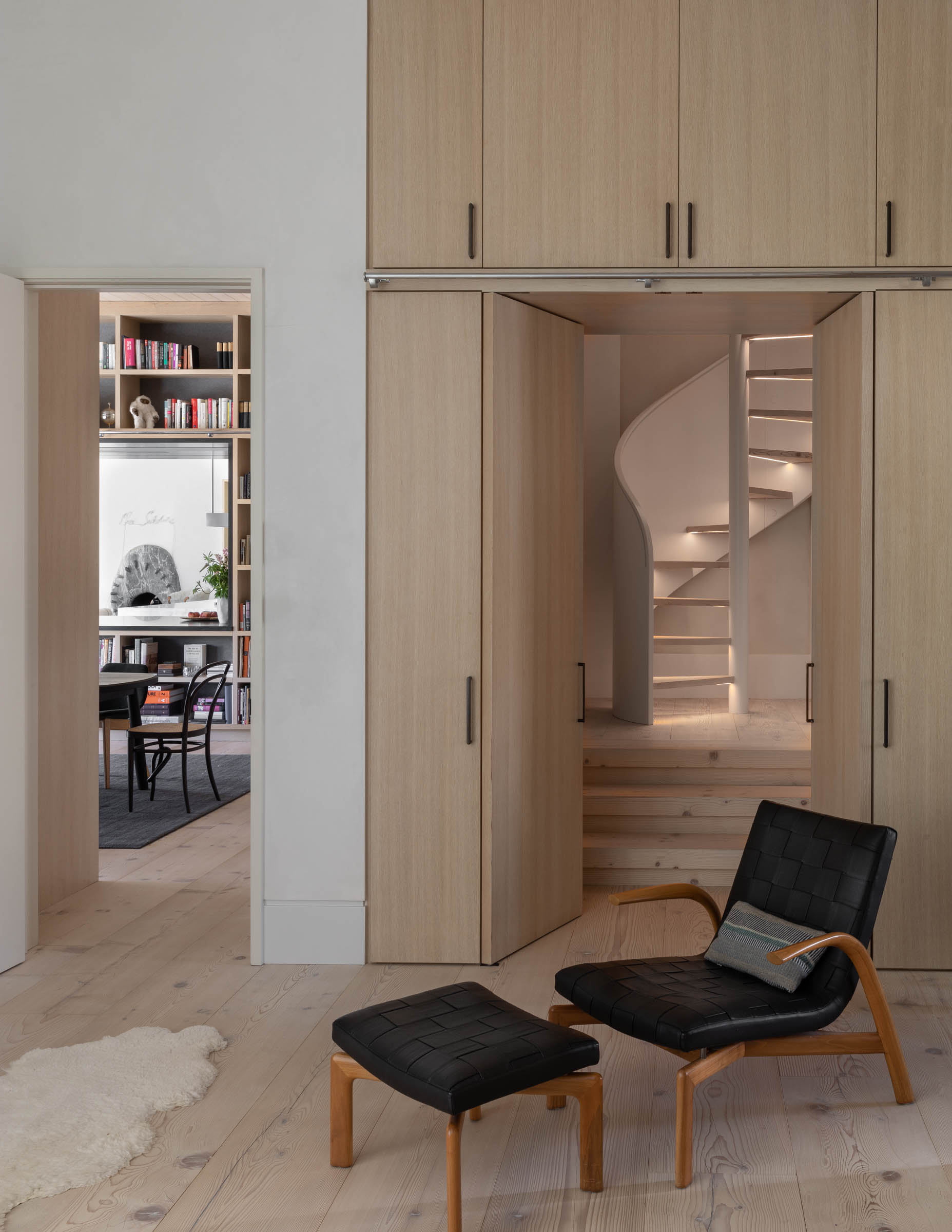 On the main floor, from the entry to the living area to the library/dining room, the sense is of a grand loft space, Scandinavian in its material simplicity, with eleven-foot ceilings and enormous, view-embracing glazed walls. Yet each space retains its own special character: if the overall experience is holistic, the rooms remain distinct and discrete.