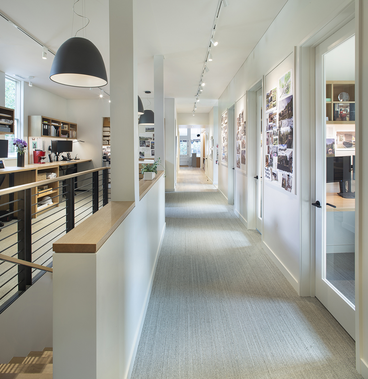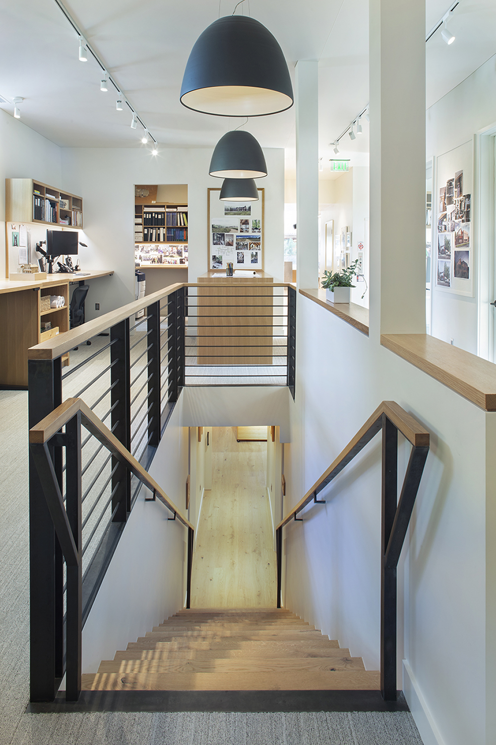 The sustainably designed tri-level interior is modern and bright, featuring white painted walls, white oak millwork and character grade oak flooring accented with black hardware and guardrails. In addition, all ceilings are white acoustic fabric by WhisperSpan.