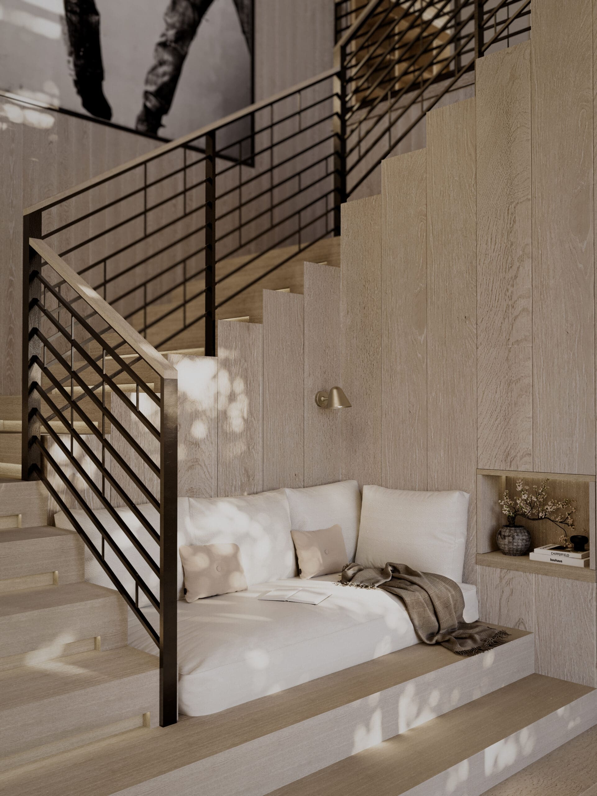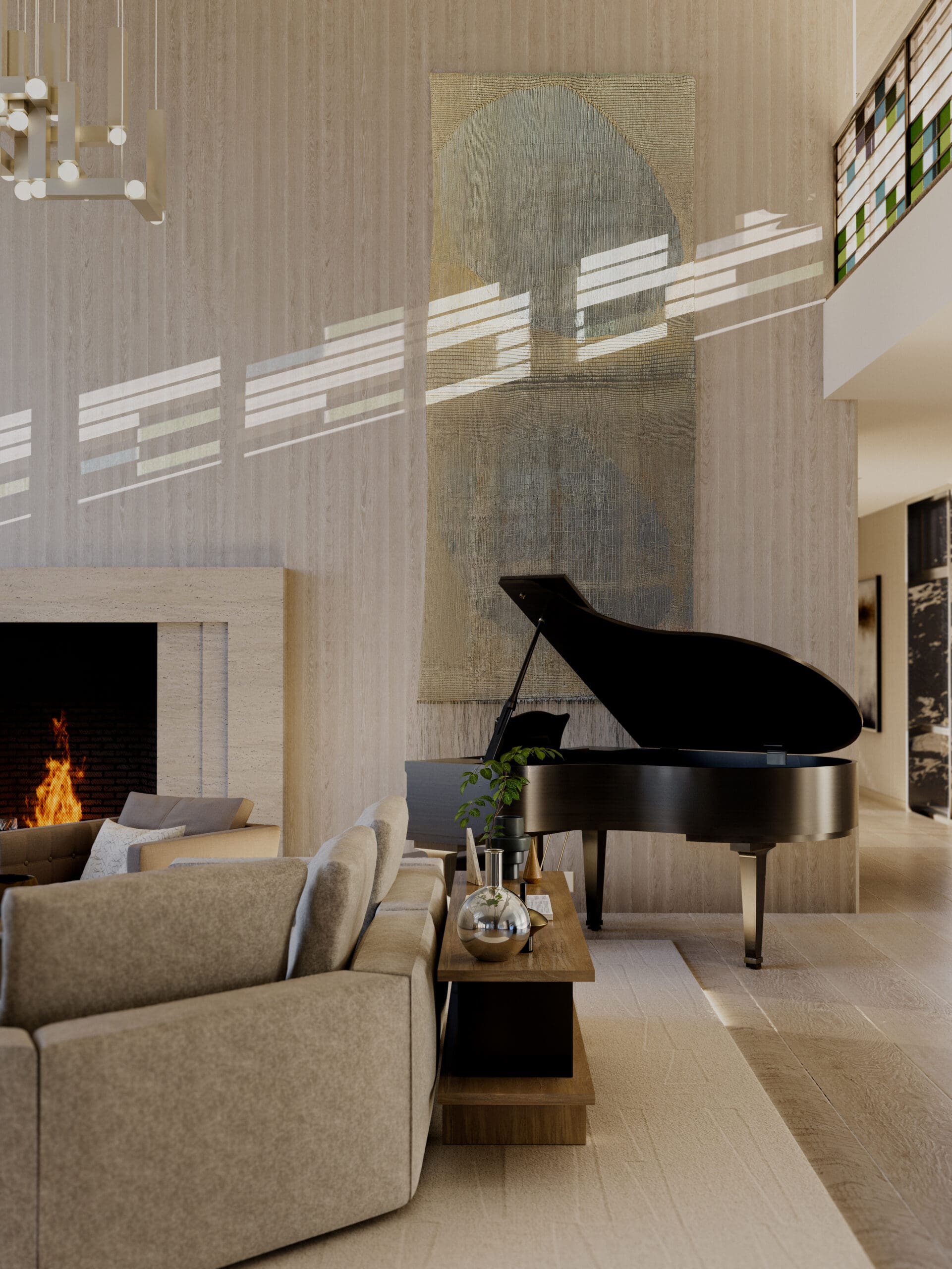 The family sought a dwelling in which to celebrate their love of music, beauty (natural and human-made), art, and craft, an environment rooted in modesty, faith, and genuineness. Our response is captured in the design’s signature element: a Venetian-made stained glass guardrail, spanning the full length of the double-height living room’s mezzanine, for which we designed a pattern based on the score of the great hymn ‘Amazing Grace’ – a gesture at once bravura in conception and execution, and humbly spiritual in its intent.