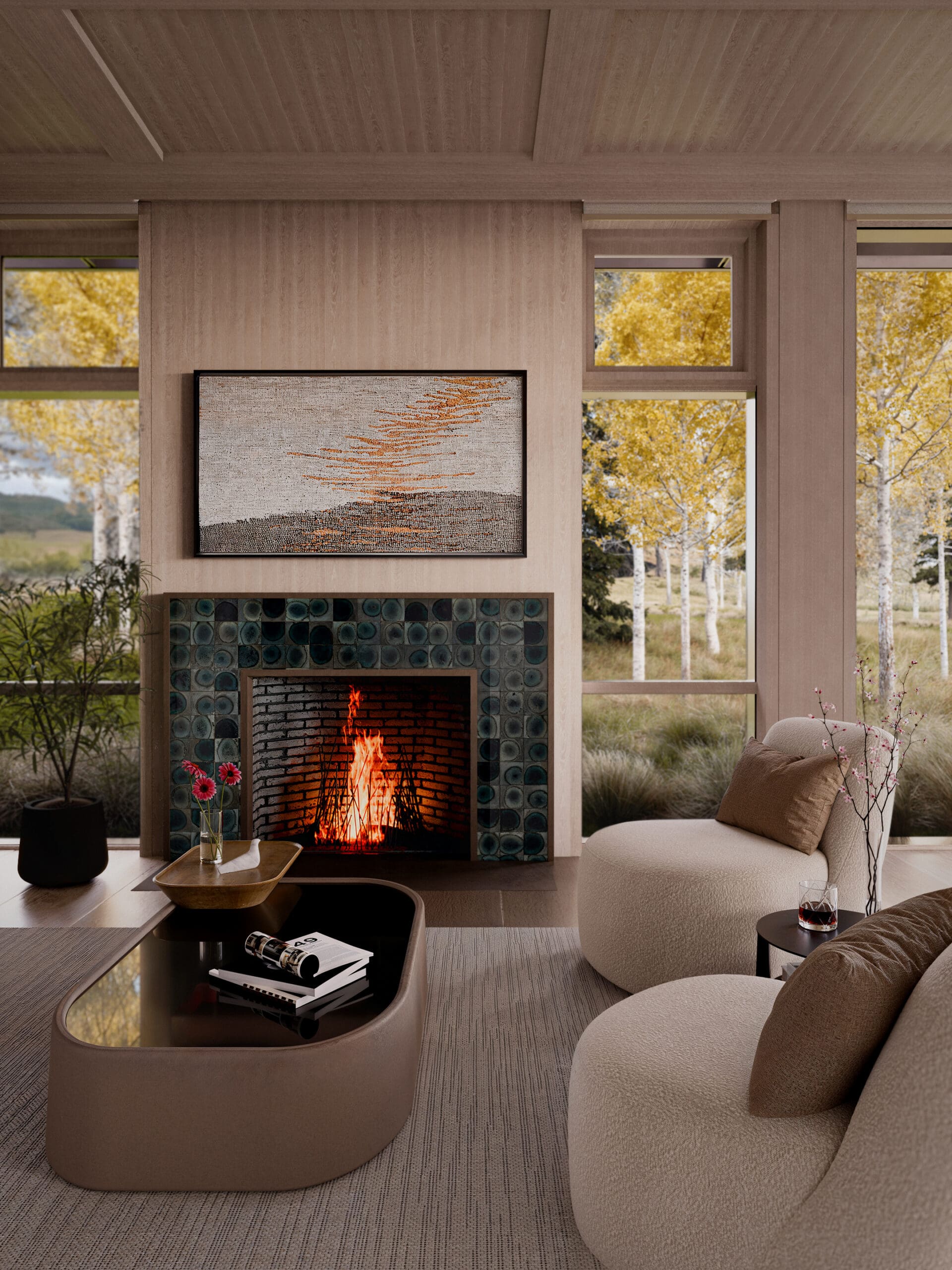 The house both commands its surroundings and defers to them. It is formidable yet, with its vast expanses of glass, transparent, a singular expression of the monumental and evanescent. The exterior is clad in a Danish brick that reveals the appealing irregularity of hand-making, laid up in overlapping horizontal layers like wood shiplap, thereby combining the rugged majesty of the landscape with the simple elegance of a rural building tradition. Within, walls finished entirely in white oak – natural, textural, sustainable – enclose a temple of tranquility and beauty, characterized by pan-cultural craft: a chandelier based on elements R+B discovered in a Milanese chapel; a custom-designed and hand-loomed Japanese wall tapestry; anodized Italian tile enriching the fireplace surrounds.