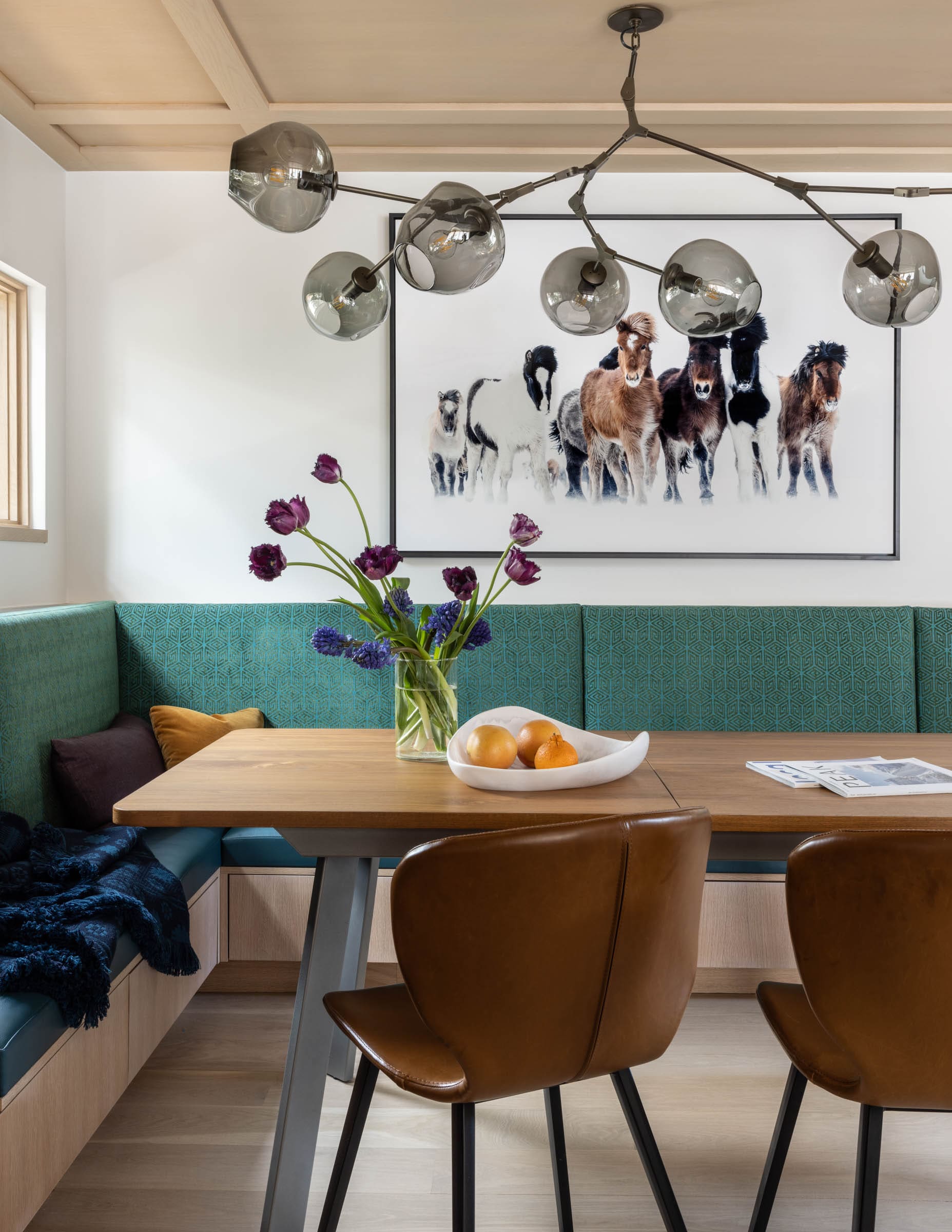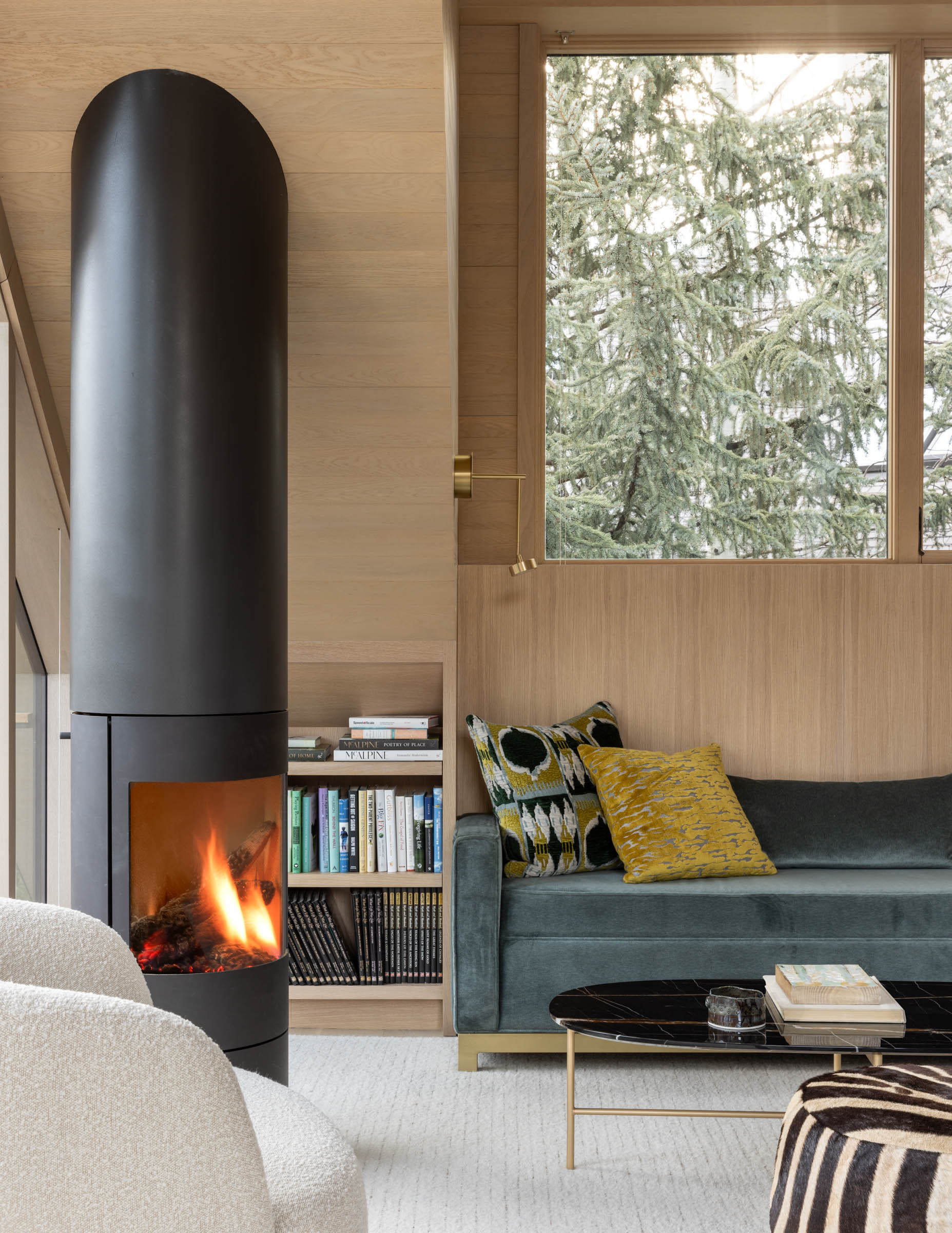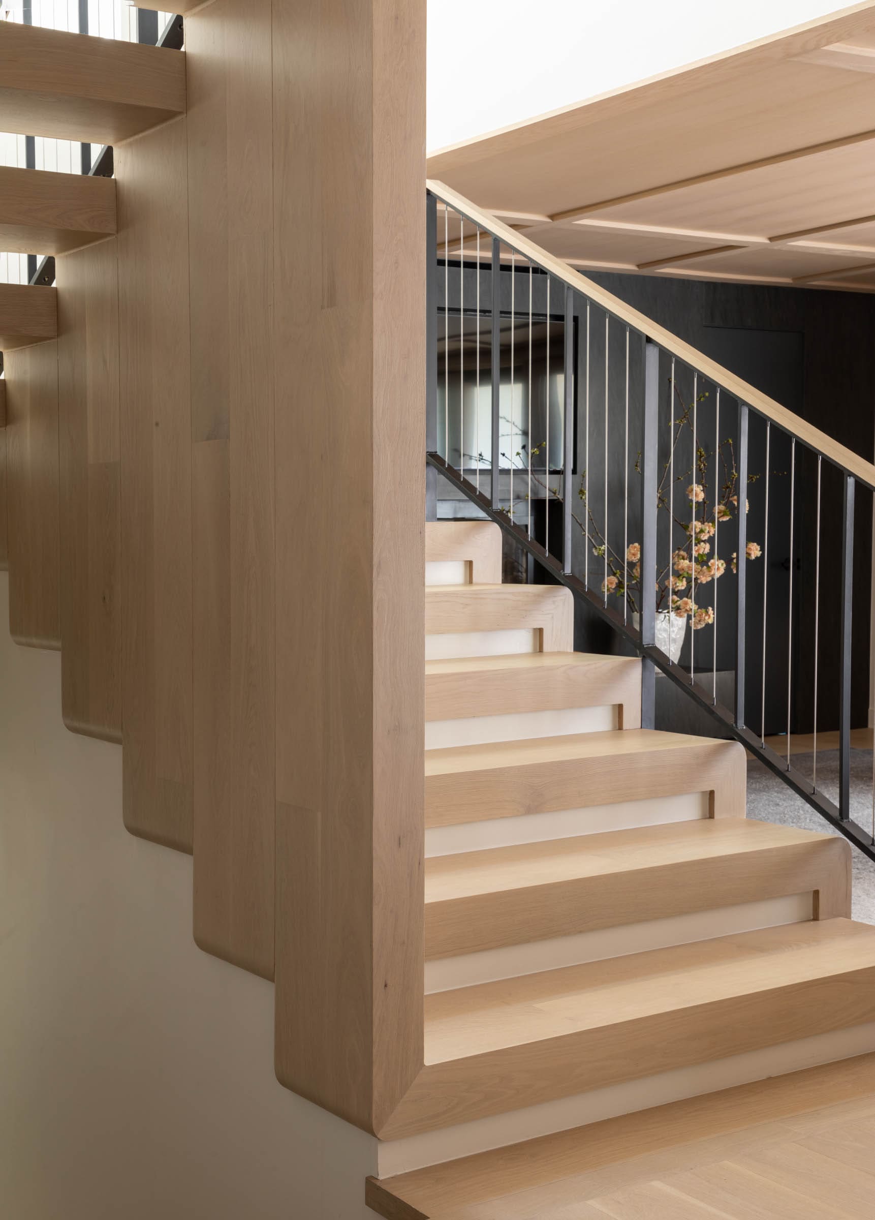 A new open wood stair allows light to circulate throughout the home. In addition to the stair, custom detailing on elements such as wood ceilings give a nod to the vernacular of earlier ski chalets, while introducing a more modern aesthetic.