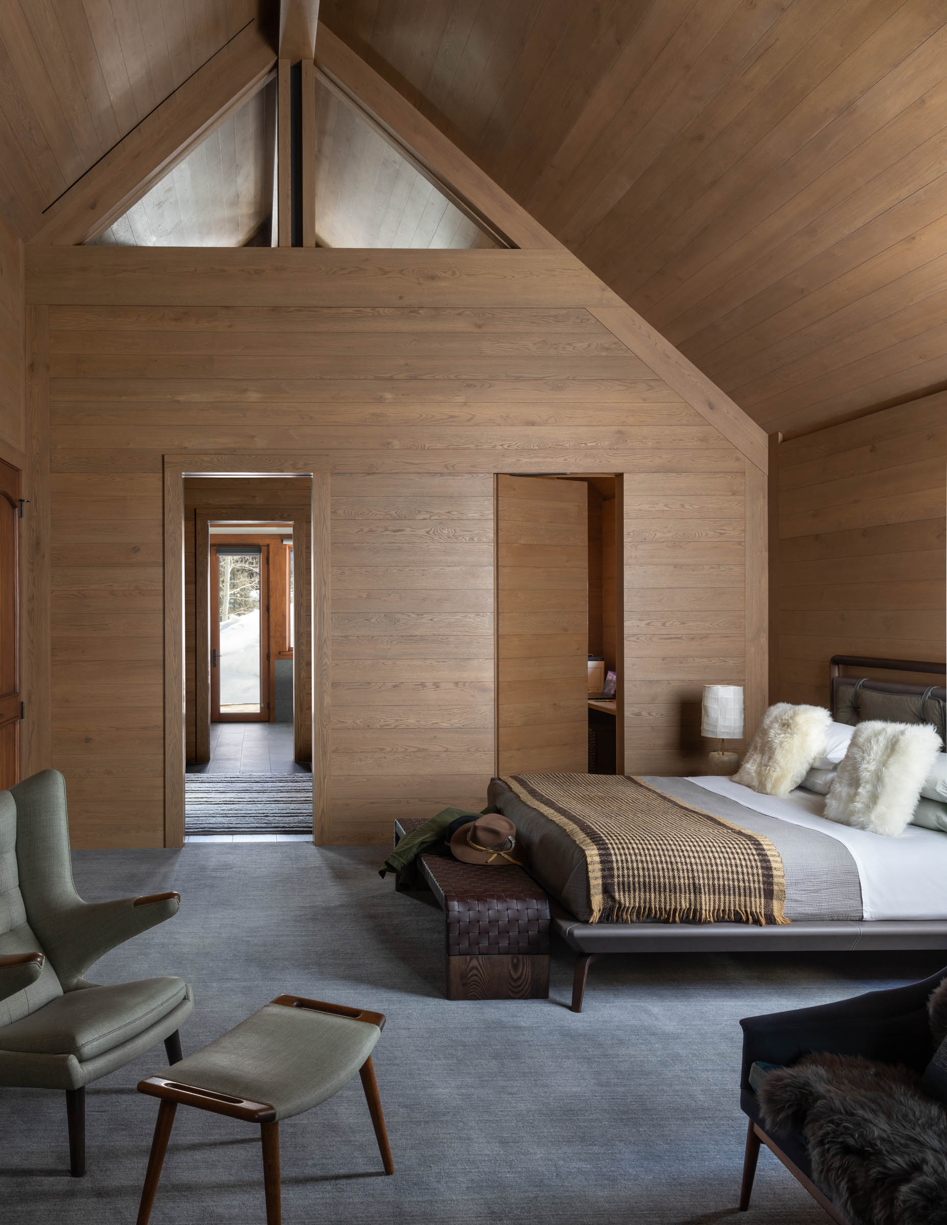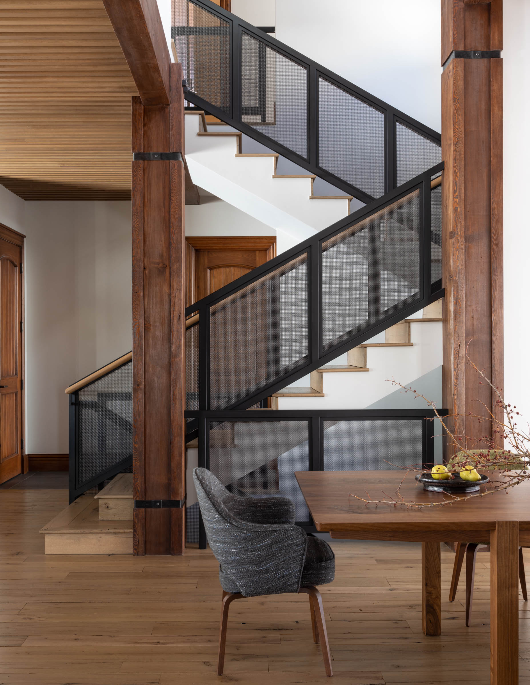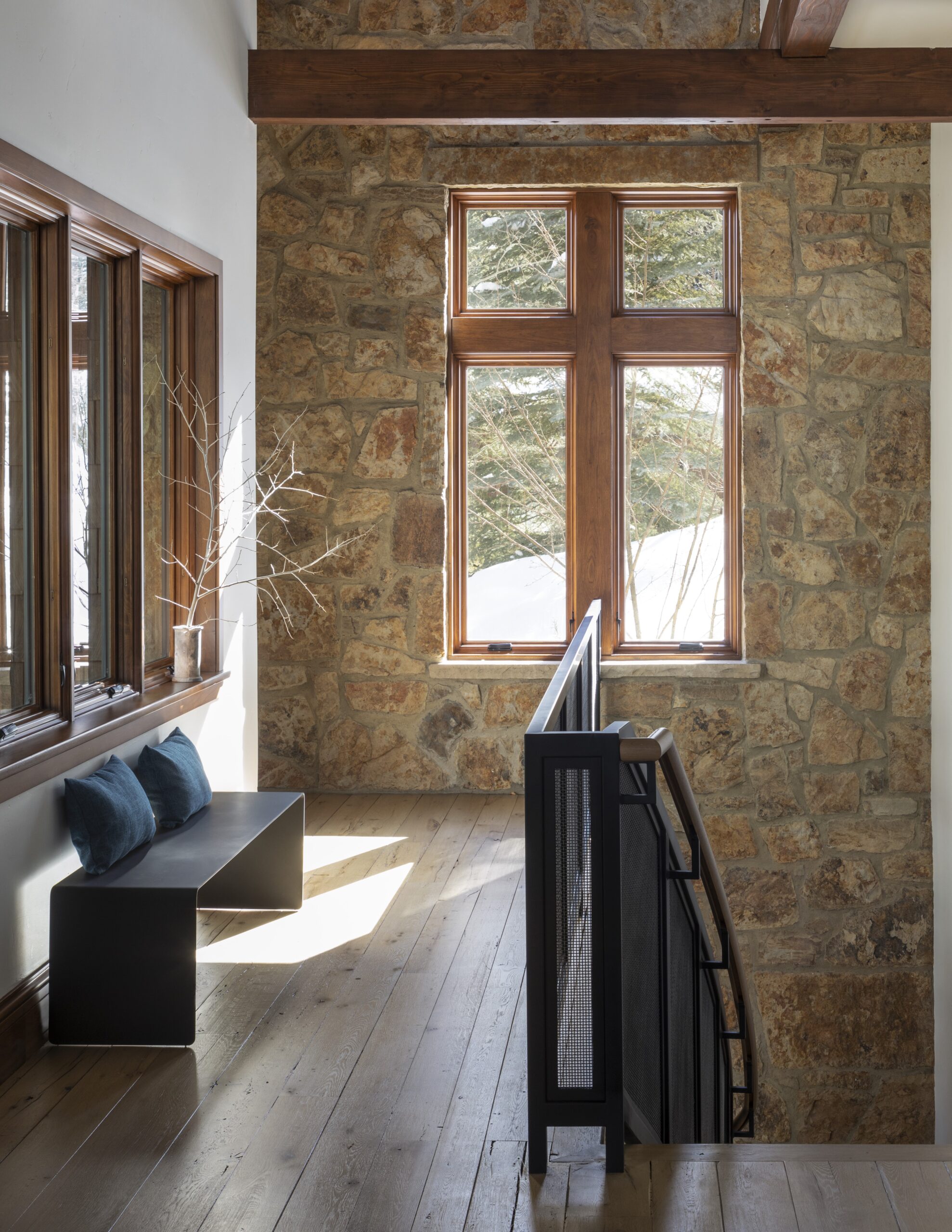 A lounge off the living room, a few steps below the kitchen, was entirely walled off; we elevated it to the kitchen level and merged the two spaces, giving the lounge better light and linking it to the house’s larger social experience. The stairway between the first and second floors had been entirely enclosed; the enclosure was replaced with steel mesh, producing a visual connection between the two stories. New interior windows on the second floor offer views from a hallway down to the dining room. A remotely located guest bedroom/sitting room suite creates privacy for elders (and an elevator connecting all three levels makes access easier for all ages). Mountainside terraces and nooks extend the living experience to the outdoors, and a ‘ski-in/ski-out’ gear room provides access to the slopes.