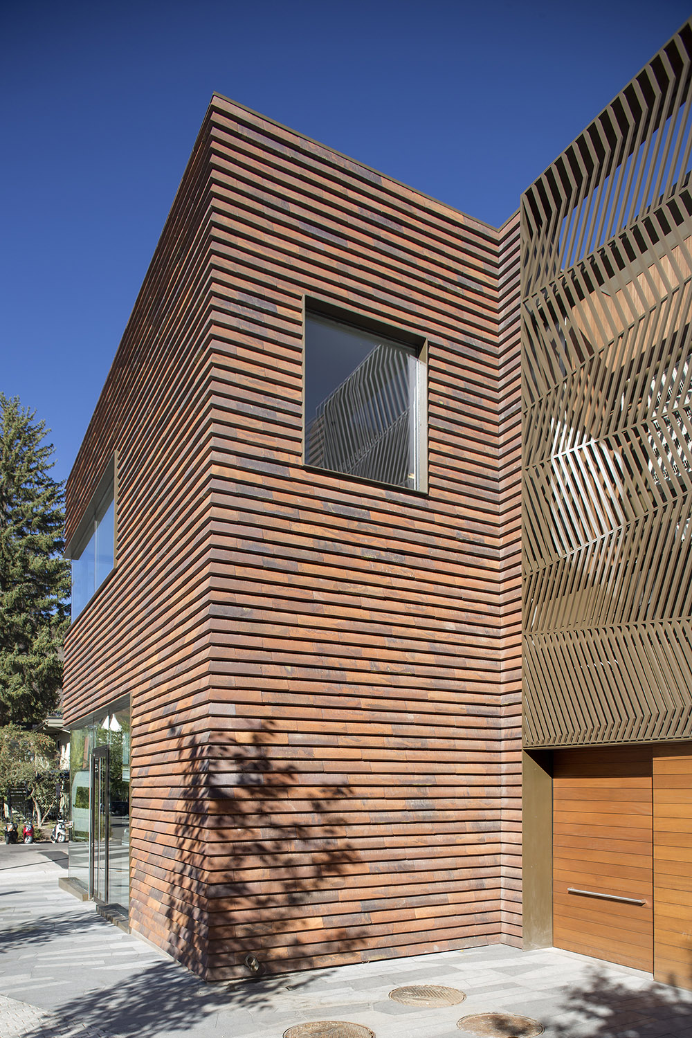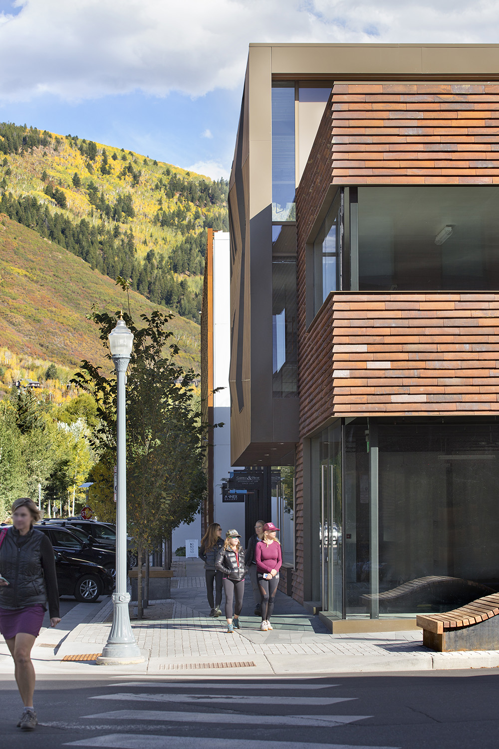 Peterson Cover Brick from Denmark represents the stationary mass of the rock outcropping. These handmade bricks are detailed using a lapped siding technique with hidden fasteners, which recalls the many wood sided buildings that once were prevalent throughout downtown Aspen during the early mining years. African Mahogany represents the snow pillow and is detailed with an undulating façade to indicate the stratified lines of past snowstorms and is cantilevered over the masonry façade. This wood pillow also has another layer of significance in that of the old false storefront façades prevalent in mining towns during the turn of the century. However, unlike those historical applications where billboard and signage indicated the use or merchandise of those buildings, the snow pillow’s silent message is that Aspen is now an international destination for skiing and sells dreams of abundant snow fall.