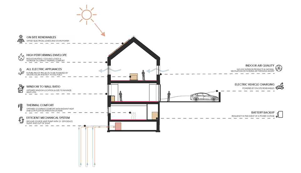 R+B prioritizes the use of healthy, natural materials, optimizes natural lighting, and incorporates renewable energy sources as integral aspects of our projects. Equally important, we focus on minimizing waste, optimizing water usage, promoting biodiversity in our designs, and collaborate with consultants to reduce embodied and operational carbon to create buildings with a low carbon footprint. To accomplish this, we have identified baseline performance standards for our projects. These standards are included in our design process from the first meeting with a client through a 12-month post-occupancy evaluation.